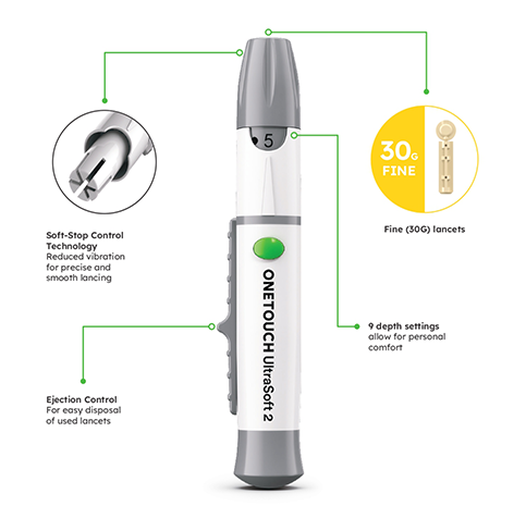 Reduced vibration for precise and smooth lancing. Fine (30G) lancet. 9 depth settings.